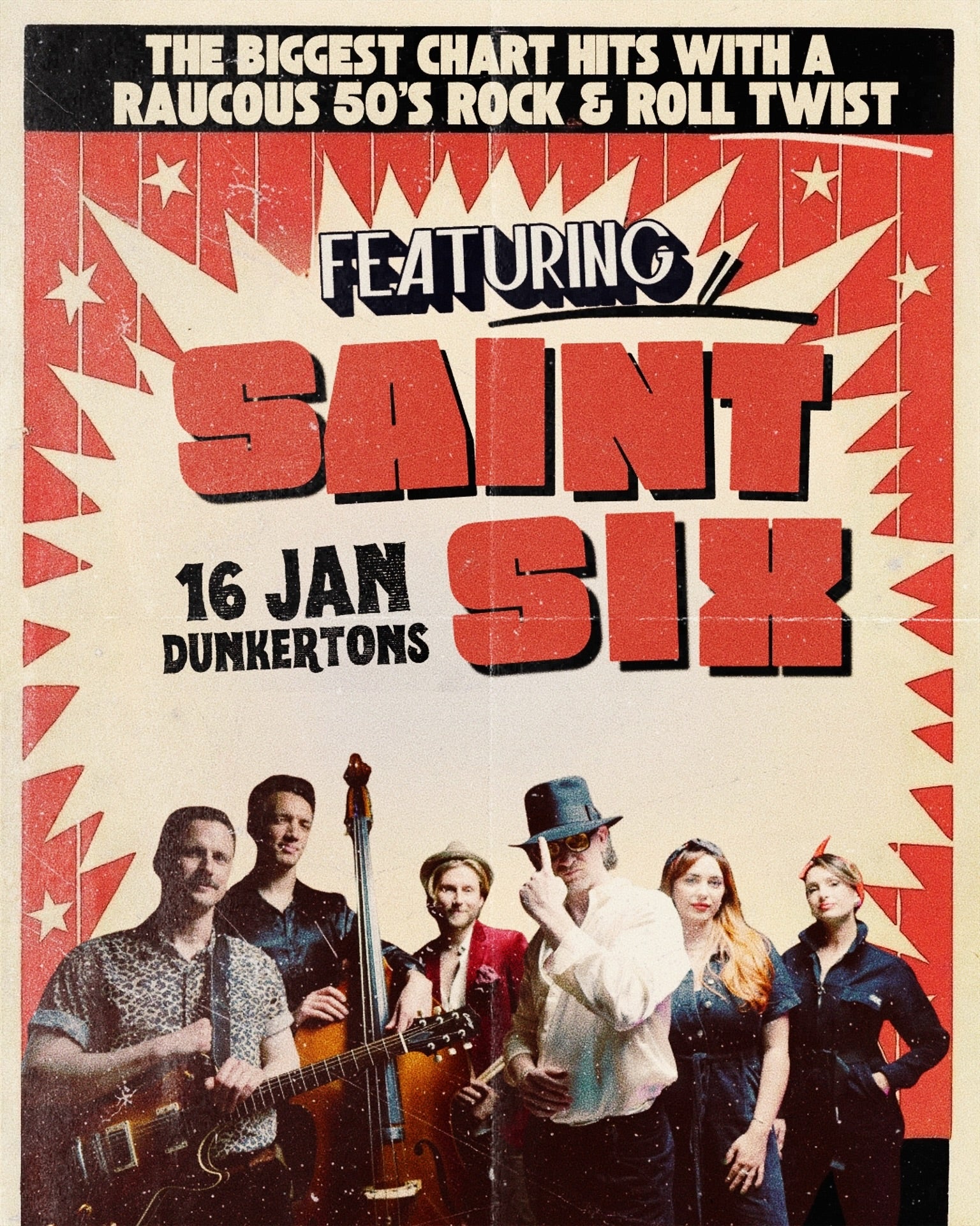 Saint Six are a red-hot collision of past and present — a razor-sharp band with 1950s swagger and a taste for the biggest modern chart floor-fillers. Fronted by the effortlessly charismatic Saint, they take the songs you know and love and launch them into a jukebox time machine, reworking them with an authentic, rip-roaring 50s sound that’s guaranteed to raise the roof.